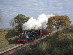 A photo charter at the SVR featuring 5526 (which is visiting from the South Devon Railway) on matching carmine and cream coaches. Unfortunately the weather wasn't too kind. |
