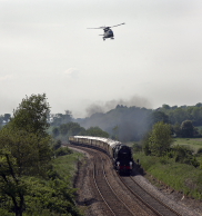 35028 "Clan Line" on a circular trip from Victoria across the Surrey Hills. Despite the temperature being 25c there was still some smoke effect. You'll notice the helicopter in hot pursuit! |