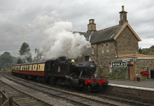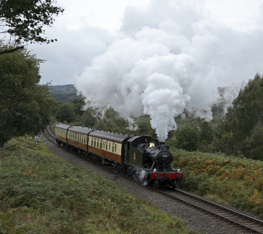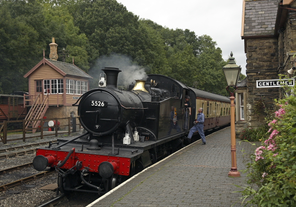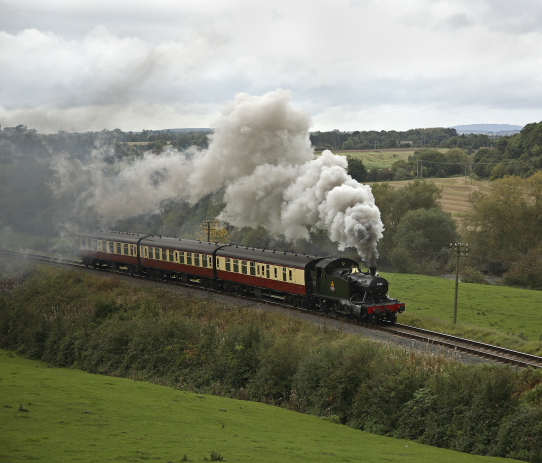 A photo charter at the SVR featuring 5526 (which is visiting from the South Devon Railway) on matching carmine and cream coaches. Unfortunately the weather wasn't too kind.