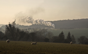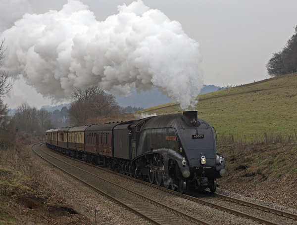 A tale of what could have been! It had the making of a nice glint shot, however the wind did it's worse with the smoke. 35038 "Clan Line" is seen approaching Mortimer on a VSOE from Victoria to Southampton. |