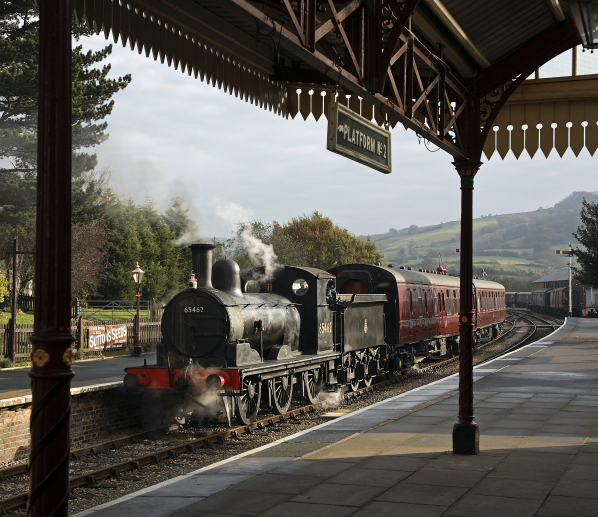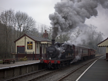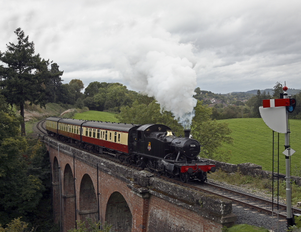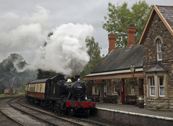 A photo charter at the SVR featuring 5526 (which is visiting from the South Devon Railway) on matching carmine and cream coaches. Unfortunately the weather wasn't too kind. |