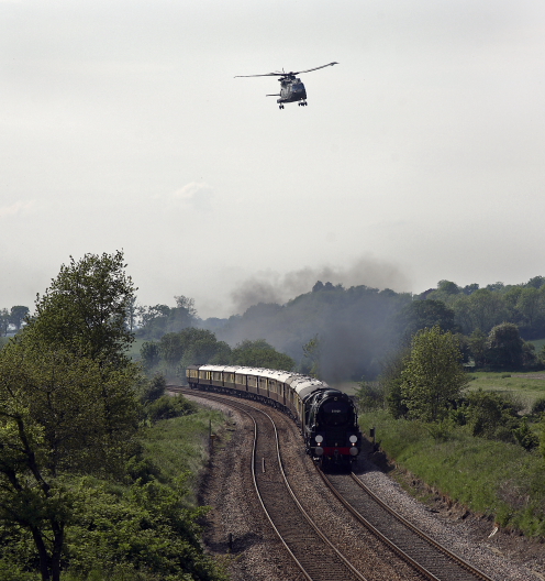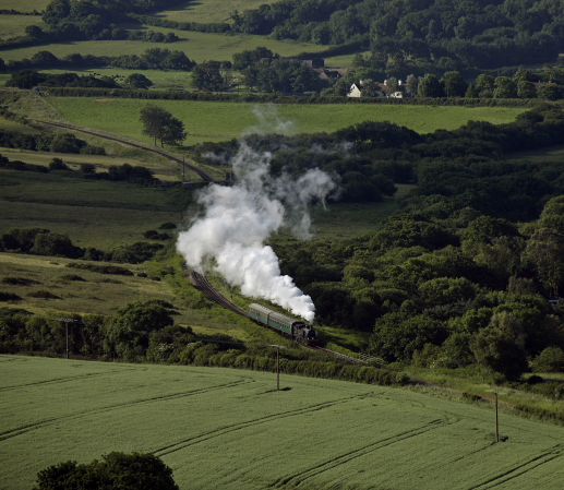 35028 "Clan Line" on a circular trip from Victoria across the Surrey Hills. Despite the temperature being 25c there was still some smoke effect. You'll notice the helicopter in hot pursuit! |