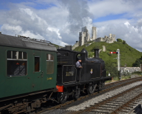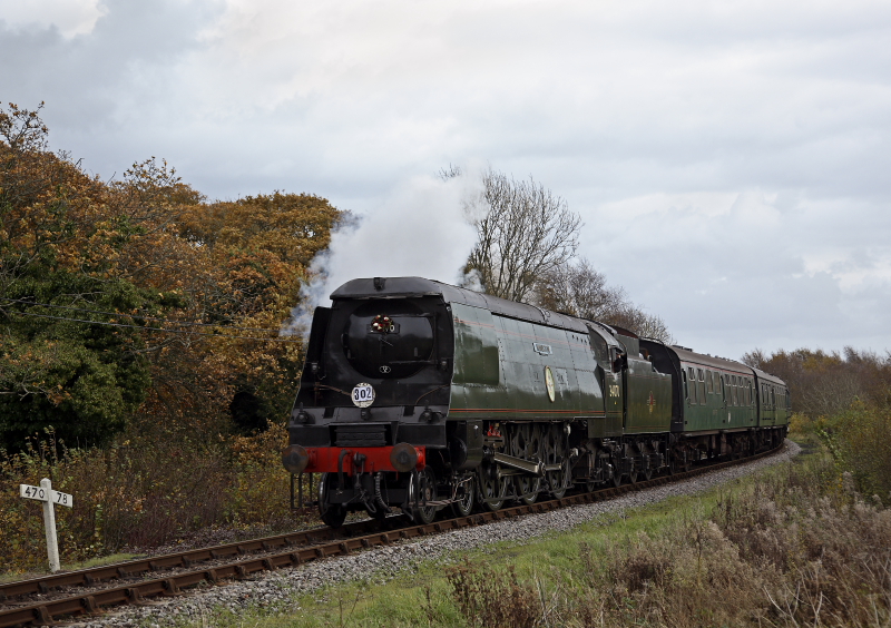 The annual autumn gala at Swanage, featured the usual home fleet on a mixture of passenger and freight trains.. The Sunday of the gala also saw the first passenger trained worked by 34070 "Manston" since its restoration from scrapyard condition. |