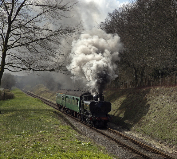 The annual spring gala in pretty awful weather! GWR auto tank 1450 (and matching auto coach) visited to compliment the home fleet. A number of period road vehicles where also on display at Horsted Keynes |